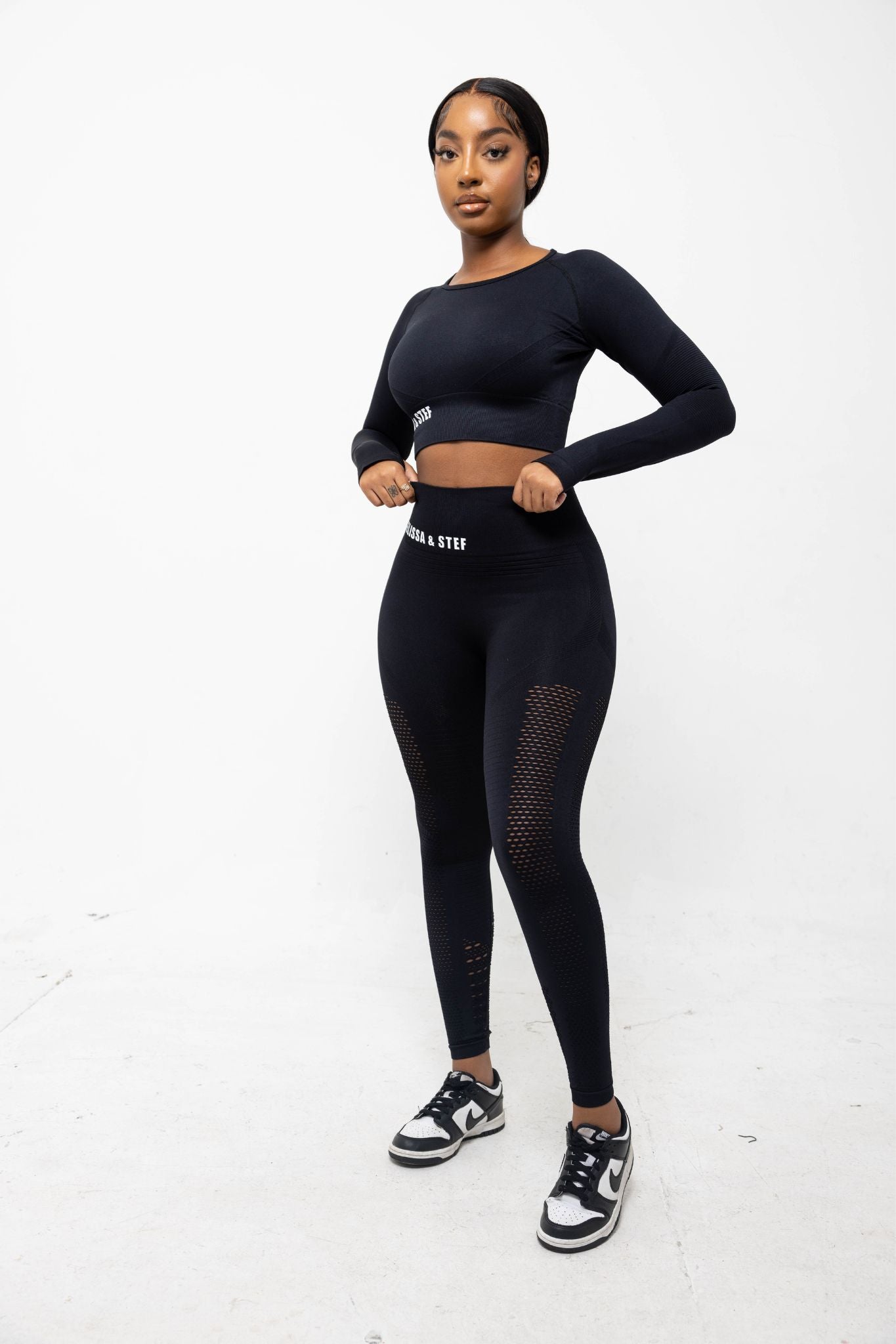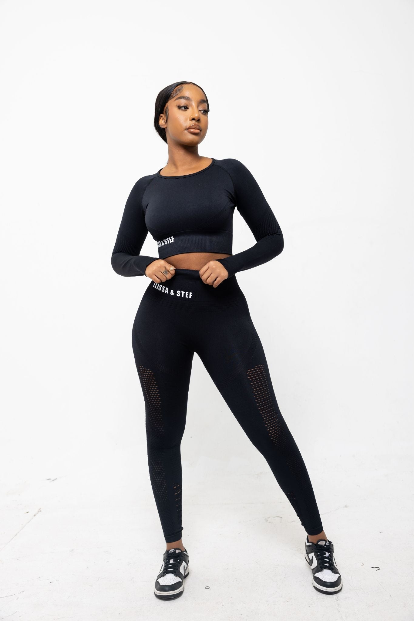 The Elissa & Stef high-waist sports leggings are designed to blend comfort, functionality, and style. Featuring a sleek black design with breathable mesh panels, these leggings are ideal for intense workouts or casual wear. The signature "Elissa & Stef" branding adds a touch of elegance to your activewear wardrobe.