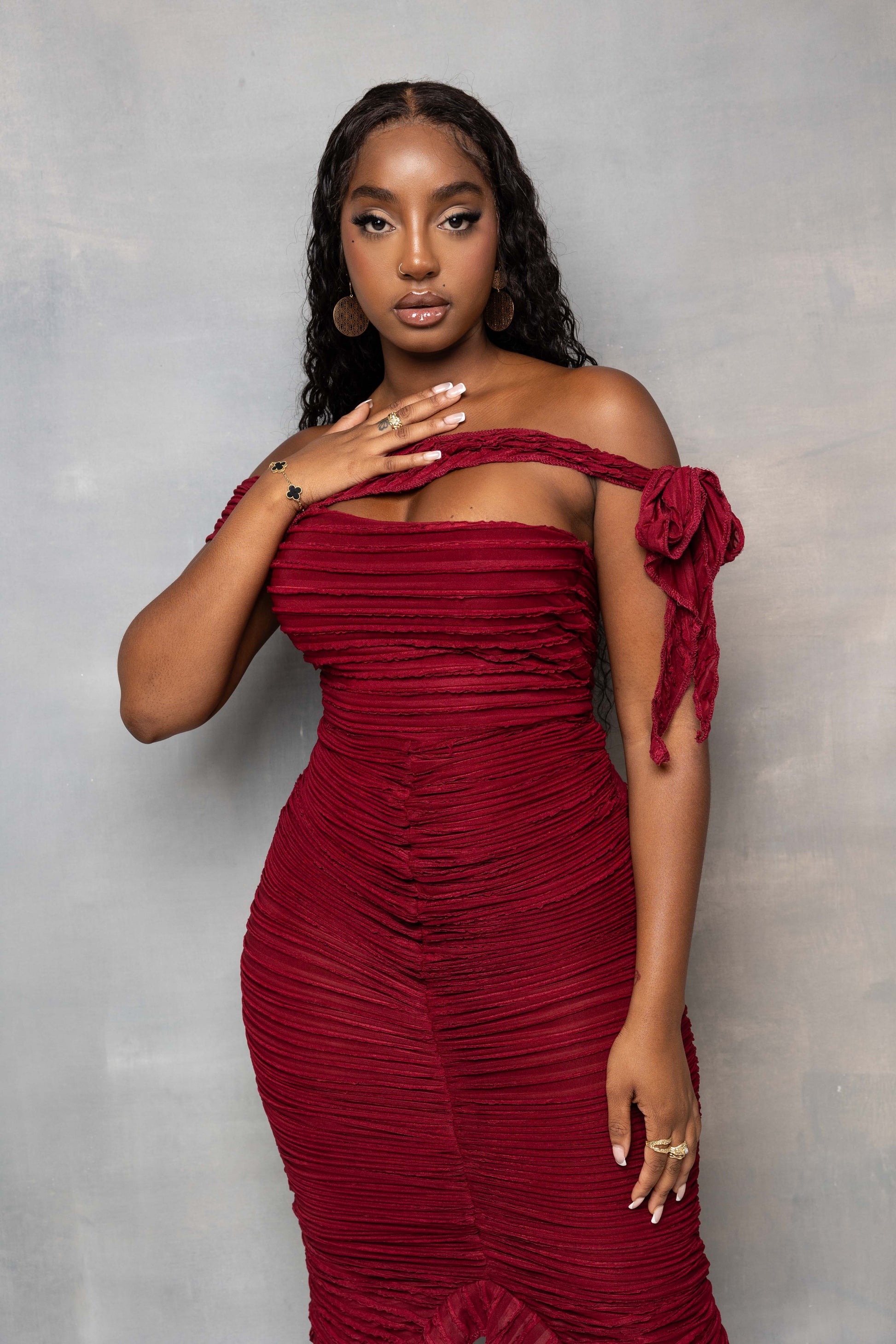 This perfect off-shoulder midi dress is designed for a bold lady, It is made from a stretchy material that hugs your curves flawlessly.